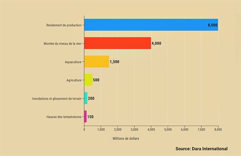 Sur le plan des dégâts, d'après Dara, organisation internationale qui étudie l'environnement, le réchauffement climatique pourrait causer des dommages estimés à 15 milliards de dollars chaque année, soit 5% du PIB national. Concrètement, l'élévation du niveau de la mer ferait subir des pertes de 1,5 milliard de dollars pour le secteur aquacole et de 0,5 milliard pour l'agriculture.