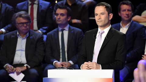 | Benoît Hamon sur le plateau de BFM TV et CNews, le 4 avril à La Plaine-Saint-Denis. |