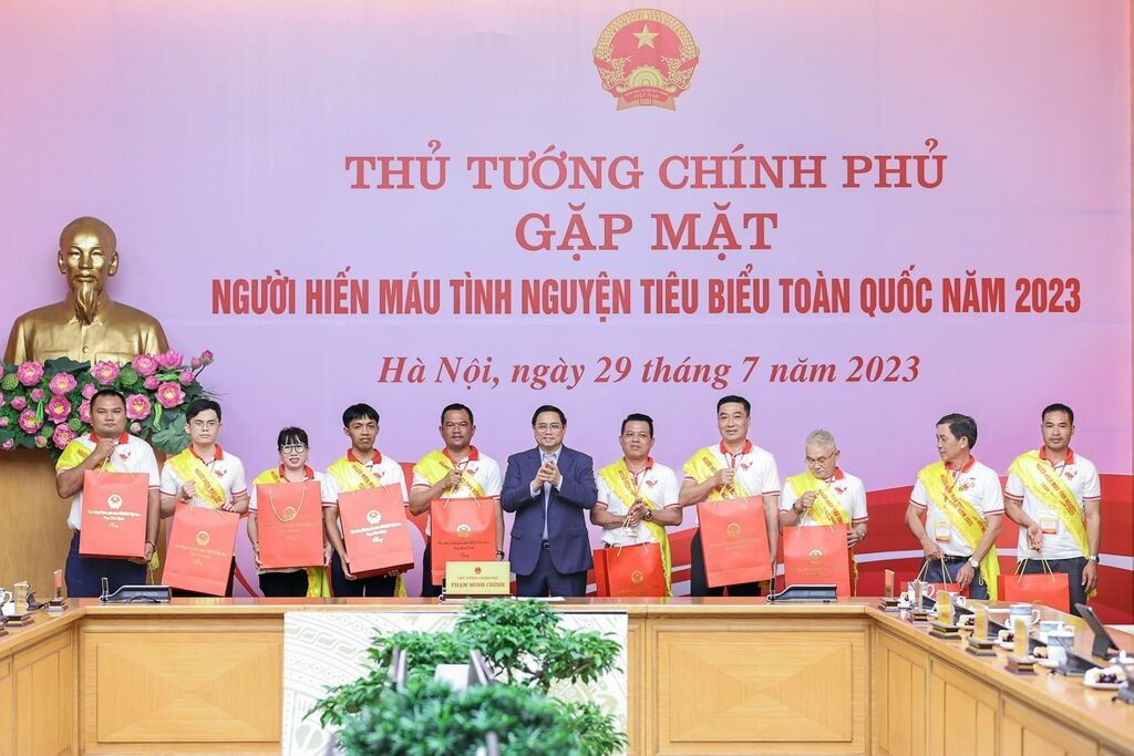 | Le Premier ministre Pham Minh Chinh (centre) et les donneurs de sang honorés, le 29 juillet à Hanoï. |