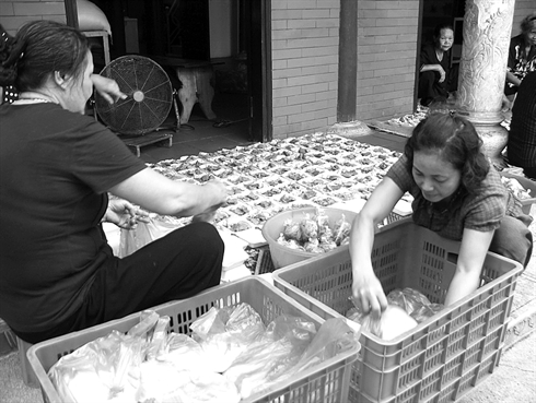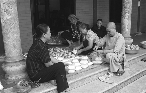 | Dès l’aube, la bonzesse supérieure Thich Nu Nhu Hiên et une vingtaine de bonzesses de la pagode préparent chaque jour environ 250 repas et des soupes de viande. |