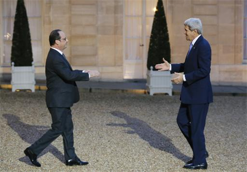 | Le président français François Hollande (gauche) accueille le secrétaire d'État américain John Kerry, dans la cour de l'Élysée, le 16 janvier à |