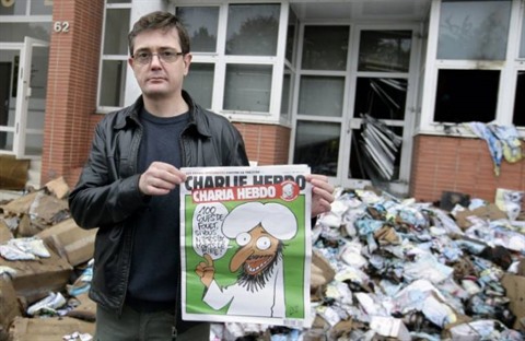 | Charb brandit le 2 novembre 2011 une édition spéciale de Charlie Hebdo, après une tentative d'incendie du siège du journal à Paris. Charb sera tué dans l'attaque de janvier 2015. |
