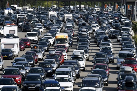 | Des automobilistes font la queue à un péage de l'autoroute A7, le 4 août près de Vienne, en France. |