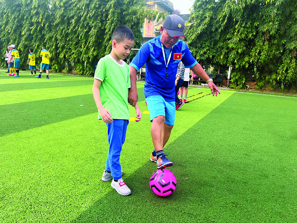 | Pham Hông Thang apprend à un enfant à jouer au football. |