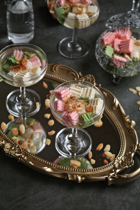 À l’origine, ce dessert ne se composait que de cubes de gelée de couleur blanche. Mais ceux-ci peuvent plus tard changer de couleur en vert, en brun ou en rose grâce au matcha (thé vert en poudre), au cacao en poudre ou au sirop de fraises qui y ont été ajoutés.