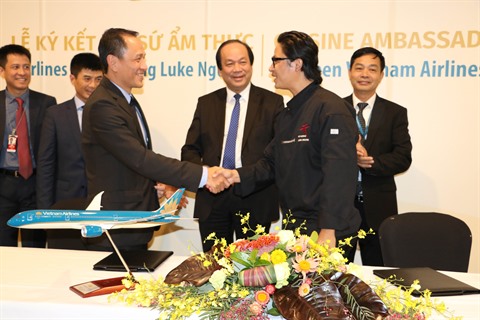 | Cérémonie de signature entre le chef Luke Nguyên (droite) et le représentant de Vietnam Airlines. |