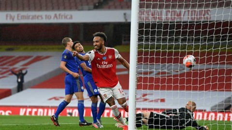 | L'attaquant d'Arsenal, Pierre-Emerick Aubameyang (centre), vient d'ouvrir le score contre Leicester, le 7 juillet à Londres. |
