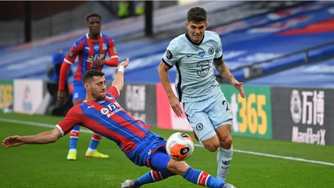 | Le défenseur de Crystal Palace, Joel Ward (gauche), tacle le milieu américain de Chelsea, Christian Pulisic, le 7 juillet à Selhurst Park, à Londres. |