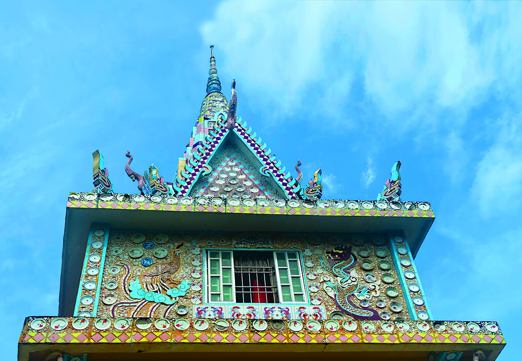 Des motifs colorés constitués de pièces de grès sont présents partout, du toit du sanctuaire aux objets sculptés tels que la déesse Kemnar, la déesse des faucons et les statues de lion qui entourent la pagode. Chén Kiêu a une beauté resplendissante, témoignant de la créativité et du raffinement esthétique des Khmers ainsi que de leur profonde connaissance de la culture bouddhiste.