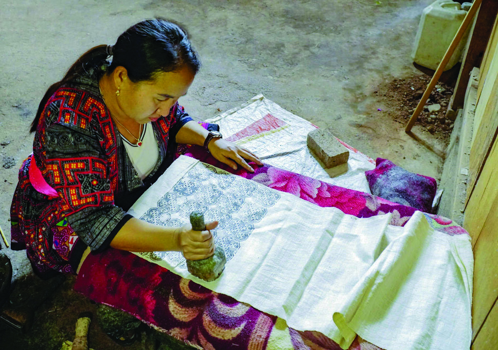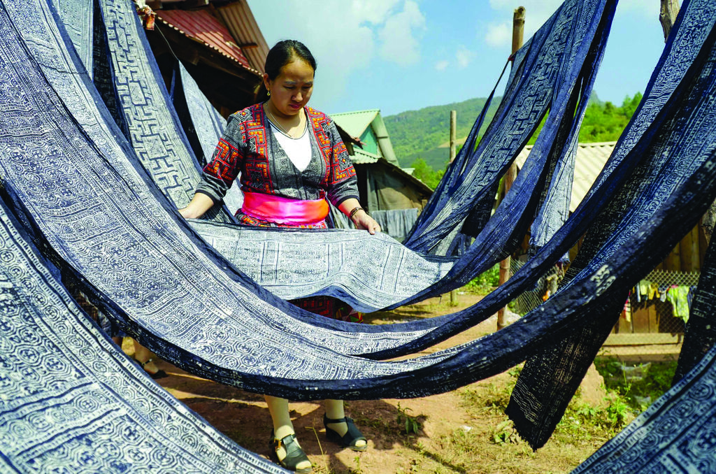 | Une femme H’mông utilise de la cire d’abeille pour créer des motifs sur le tissu. |