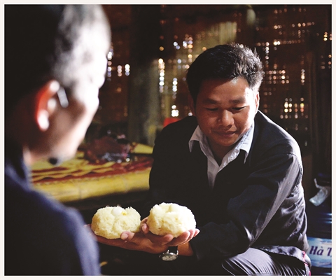Dans le salon, après le culte, le marié reçoit deux boules de xôi (riz gluant cuit à la vapeur) remis par le thây cung. Il va les remettre à son tour à son épouse. Cette paire symbolise la prospérité et le bonheur du jeune couple.