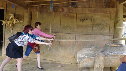 À l’entrée de chaque maison Mông, se trouve un égrugeoir. Thanh Tâm, une touriste, veut essayer d’égruger du maïs qui constitue aujourd’hui l’aliment des animaux.