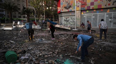 | Une rue de Santiago du Chili après des incidents entre manifestants et forces de l'ordre, le 21 octobre. |