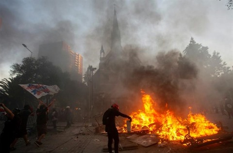 Des groupes d'hommes cagoulés se sont violemment affrontés avec la police dans les alentours de l'église, tandis que dans d'autres endroits de la ville, des manifestants ont protesté pacifiquement pour réclamer de plus grandes réformes sociales et contre le gouvernement de droite du président Sebastián Piñera.