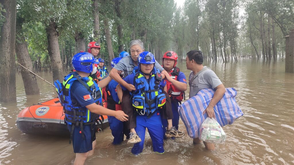 | Secours des habitants dans une zone inondée à Hebei, en Chine. |