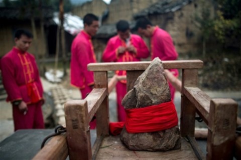 Quatre hommes vêtus de rouge, couleur porte-bonheur en Chine, et s'étant astreint à un régime strictement végétarien les trois jours précédents s'efforcent alors de porter le rocher en traversant une rivière. Mais une douzaine d'autres hommes tentent de les en empêcher à l'aide de cannes de bambous... et en frappant la statue.