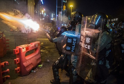 | Des policiers tirent des canettes de gaz lacrymogène lors d'une manifestation à Hong Kong, le 4 août. |