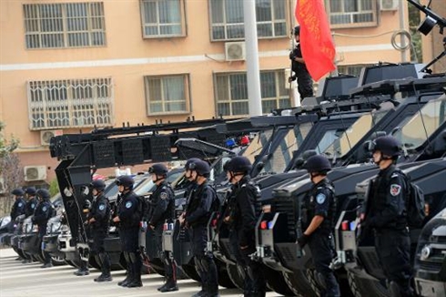 | Des forces de sécurité chinoises à Hetian, dans la région musulmane du Xinjiang, dans le Nord-Ouest de la Chine, le 6 juin 2014. |