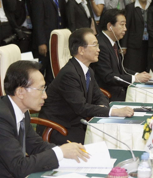 | De gauche à droite : Le président sud-coréen Lee Myung Bak, le Premier ministre chinois Wen Jiabao et le Premier ministre japonais Yoshihiko Noda, le 19 novembre à Phnom Penh. Photo : Xinhua/VNA/CVN |