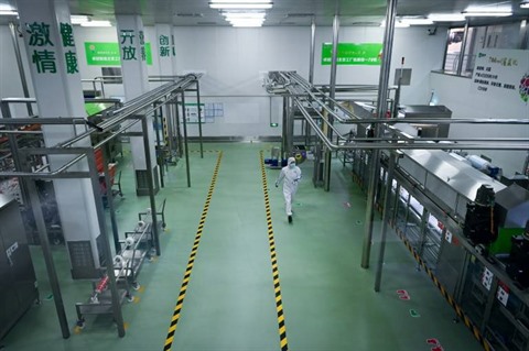 | Un employé en combinaison de protection dans une usine lors d'une visite organisée par le gouvernement chinois, le 27 février lors de l'épidémie du nouveau coronavirus. |
