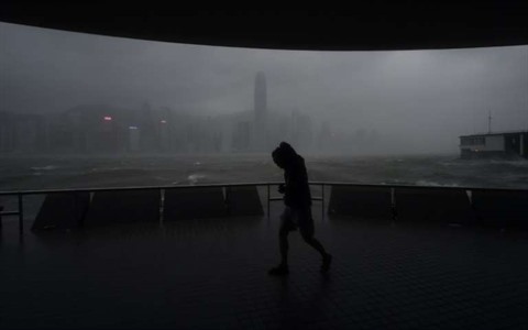 | Un homme brave le vent et la pluie sur le front de mer à Hong Kong (Chine), touché par le violent typhon Hato, le 23 août. |