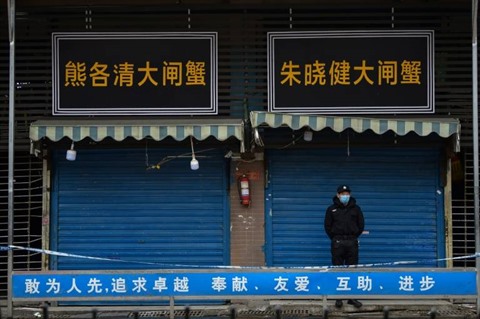 | Un vigile devant le marché de gros où le nouveau coronavirus a été repéré en premier en décembre, le 24 janvier à Wuhan. |