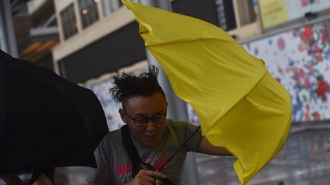 | Des piétons avec leurs parapluies luttent pour avancer lors d'une violente tempête à Hong Kong, le 27 août 2017. |