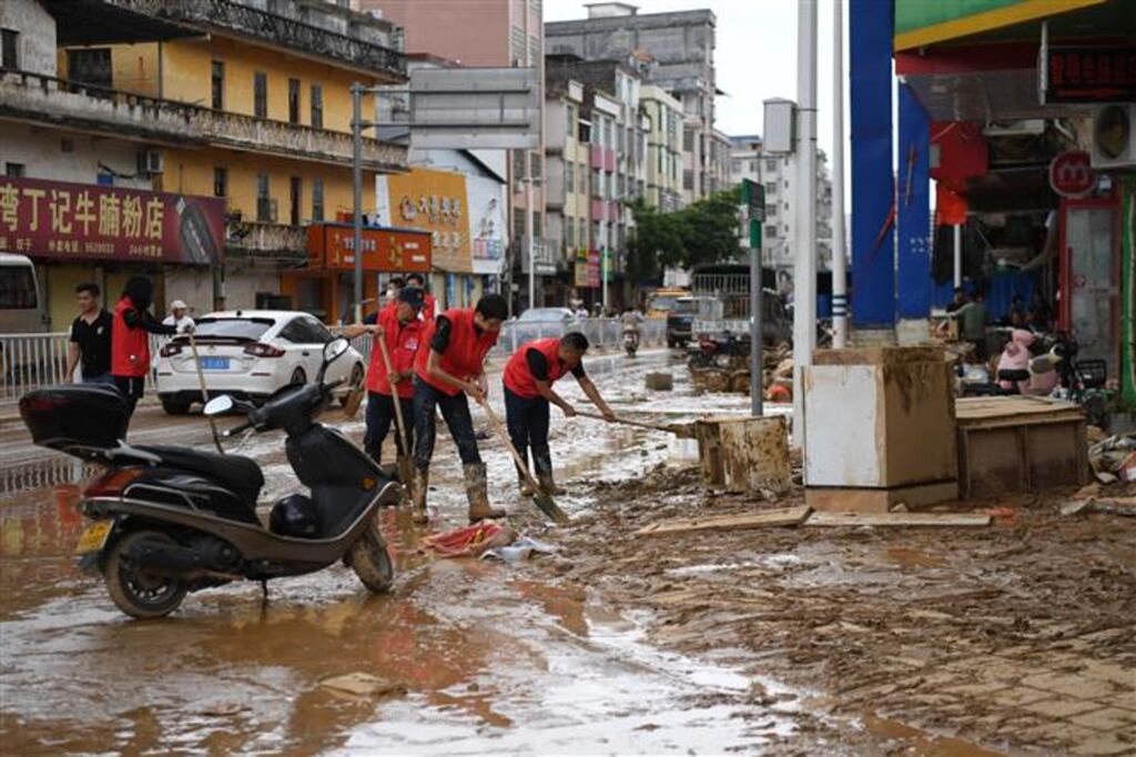 | Des volontaires balayent une rue après une crue à Guangdong, en Chine. |