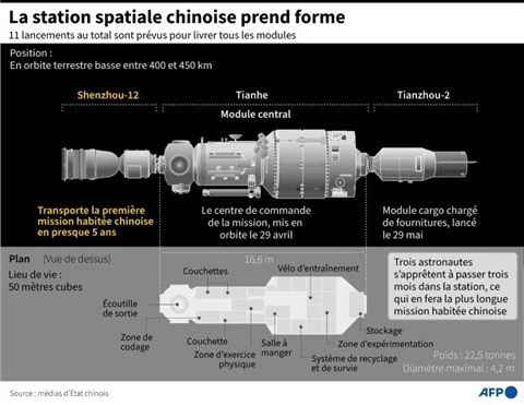 | Graphique présentant les différentes parties de la station spatiale chinoise, comprenant celle de la mission habitée Shenzhou-12 lancée le 17 juin. |