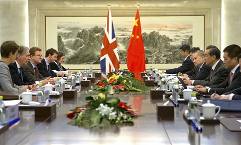 | Le ministre chinois des Affaires étrangères Wang Yi (droite) et son homologue britannique Philip Hammond, le 5 janvier à Pékin. |