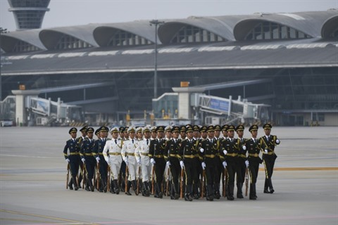 | Des gardes d'honneur sur le tarmac de l'aéroport de Qingdao pour l'arrivée des chefs d'État invités au sommet de l'Organisation de coopération de Shanghai (OCS), le 8 juin en Chine. |