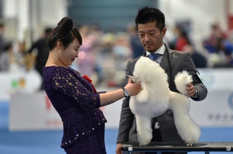| Examen d'un caniche durant l'exposition canine mondiale de Shanghai, le 30 avril. |