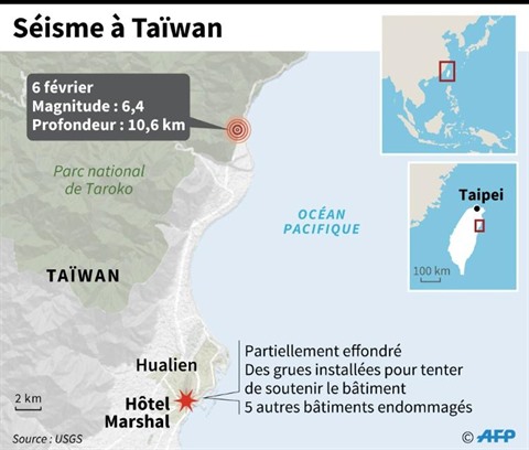 L'épicentre du séisme survenu mardi 6 février peu avant minuit (15h50 GMT) était situé à une vingtaine de kilomètres au nord-est de Hualien, selon l'institut géologique américain USGS.