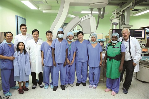 | Le Pr-Dr Dô Quang Huân (4e à gauche), directeur de l’Institut de cardiologie de Hô Chi Minh-Ville, et des médecins étrangers après une chirurgie cardiaque menée sur une fillette (2e à gauche). |