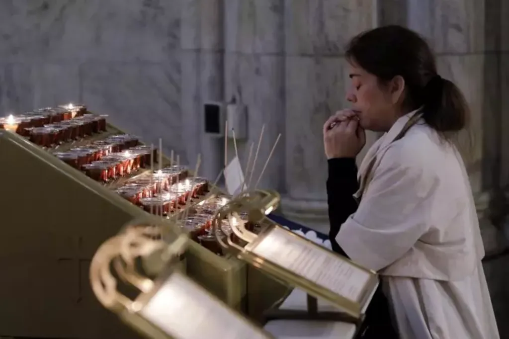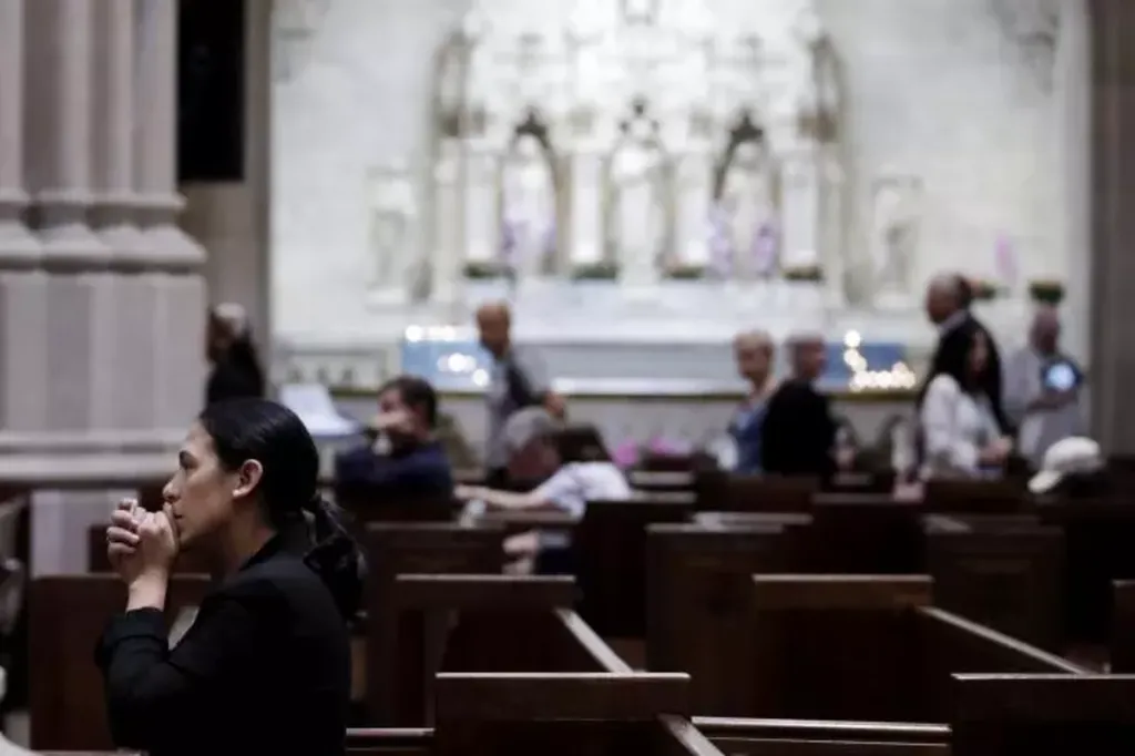 | Une femme prie dans la cathédrale Saint Patrick à New York après l'élection du pape Léon XIV, le 8 mai. |