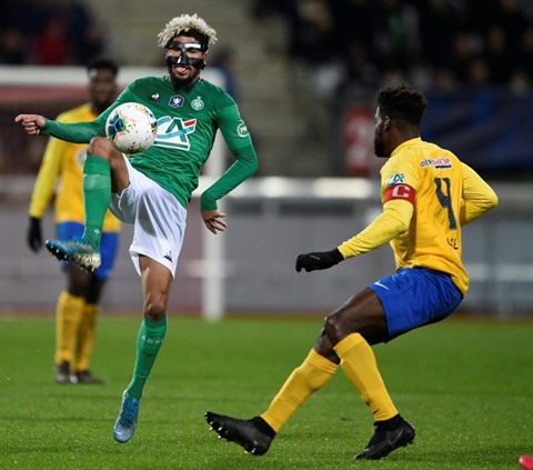 | Le milieu de Saint-Etienne Mahdi Camara (gauche) face au défenseur d'Epinal Ismaël Gace en quart de finale de la Coupe de France, le 13 février au stade Marcel-Picot à Tomblaine. |
