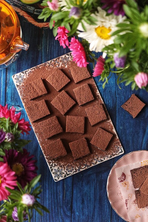 - Saupoudrer de poudre de cacao la surface des cubes.