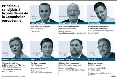 Chaque groupe a désigné son prétendant pour la présidence de la Commission européenne. Le soir même des résultats, le 26 mai, la famille arrivée en tête revendique le poste. Mais son candidat devra obtenir le soutien des dirigeants de l'Union européenne et la majorité absolue des élus du Parlement européen, soit 376 voix. Ce qui devrait donner lieu à un marchandage intensif.