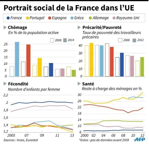 L'impact de la crise qui a débuté en 2008 a été le plus fort au Portugal, en Grèce, en Espagne, Italie et Irlande. L’Allemagne, le Luxembourg et l'Autriche ont été peu ou pas affectés. La France, le Royaume-Uni et les pays du Nord se trouvent dans une situation intermédiaire, résume l'INSEE dans l'édition 2015 de son "Portrait social de la France" incluant des comparaisons européennes.