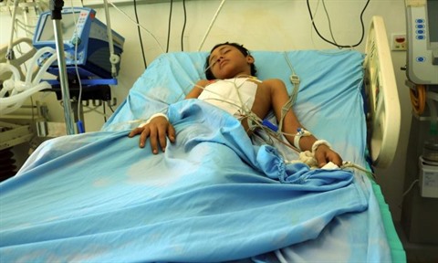 | Un enfant blessé à l'hôpital après l'explosion d'un obus dans une salle de mariage à Hodeida au Yémen, le 2 janvier. |
