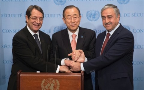 | De gauche à droite : le président chypriote Nicos Anastasiades, le secrétaire général de l'ONU, Ban Ki-moon, et le leader chypriote turc Mustafa Akinci, le 25 septembre à New York. |