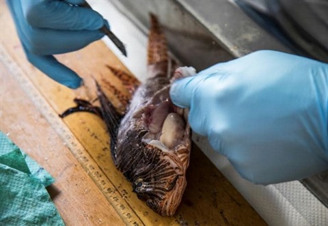 | Un poisson-lion disséqué dans le laboratoire de biologie marine d'Enalia, à Nicosie, le 10 octobre 2017. |