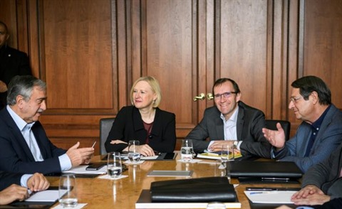 | De gauche à droite : le dirigeant chypriote turc Mustafa Akinci ; la chef des forces de l'ONU à Chypre, Elizabeth Spehar ; le conseiller spécial du secrétaire général de l'ONU pour Chypre, Espen Barth Eide ; et le dirigeant grec Nicos Anastasiades, lors d'une rencontre le 20 novembre 2016 en Suisse. |