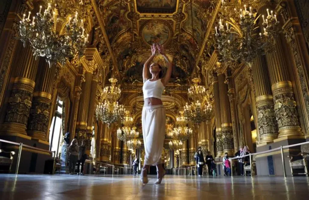 | Danseuse du ballet de l'Opéra de Paris dans le grand foyer du Palais Garnier le 19 septembre 2015. |