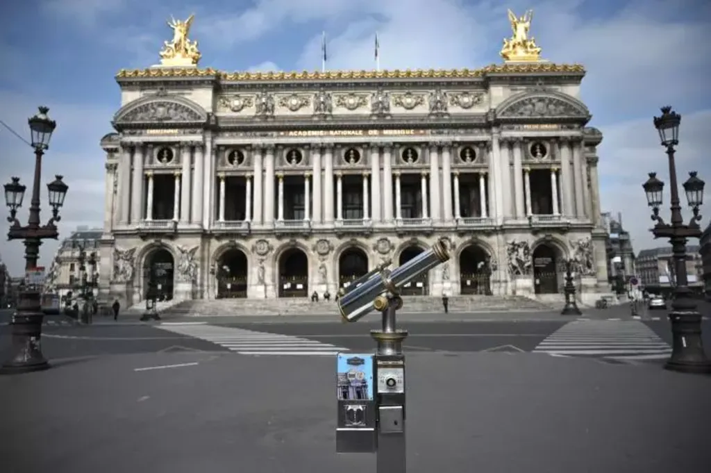 | La façade du Palais Garnier le 17 mars 2020 durant l'épidémie de COVID-19. |