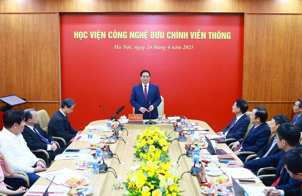 | Le Premier ministre Pham Minh Chinh (centre) lors de la séance de travail avec les dirigeants de l’Institut vietnamien des postes et télécommunications. |