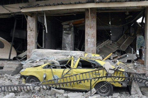 | Les dégâts causés par une explosion à la voiture piégée, le 23 mai près du quartier Al-Zahraa à Homs. |