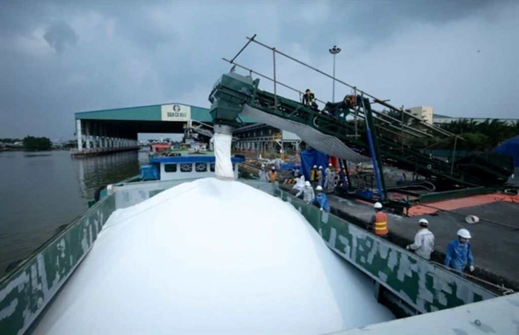 | Des ouvriers de l'usine d'engrais PetroVietnam CaMau chargent de l'urée sur un bateau pour l'exportation. |