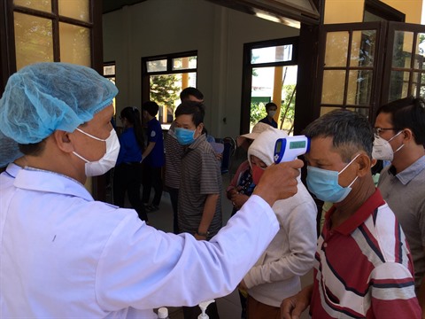 | Un agent de santé vérifie la température corporelle des passagers à une station de bus dans la commune de Huong Thuy, province de Thua Thiên-Huê. |