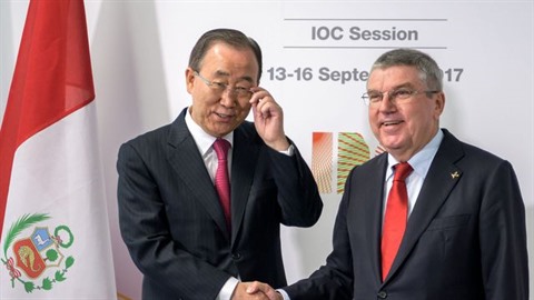 | L'ancien secrétaire général des Nations unies,Ban Ki-moon (gauche), élu à la tête de la commission d'éthique du CIO, serre la main de Thomas Bach, le 14 septembre à Lima. |